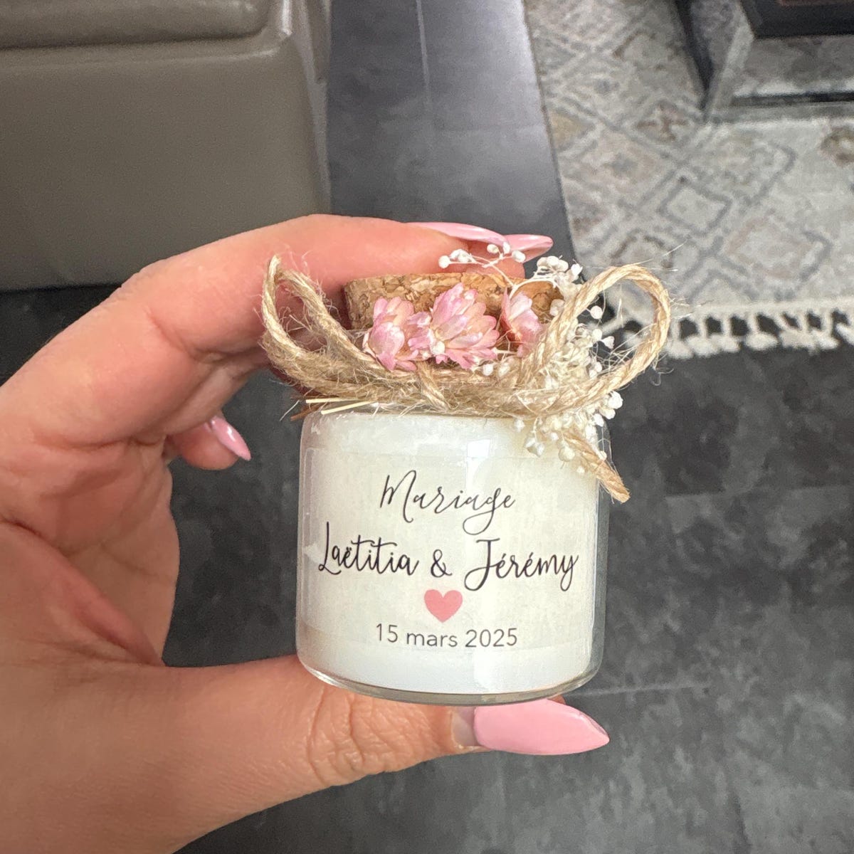- bougie avec couvercle en liège et petites décoration de fleurs séchées